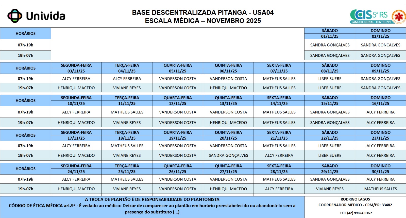 Escala Médica - Base Central Guarapuava - Novembro
